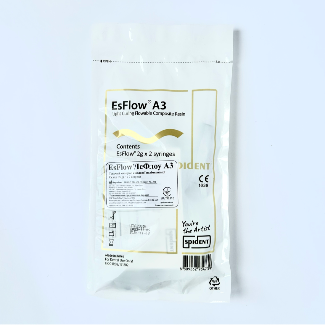 ФЛОУ- наногібридний рідкотекучий композит світлового затвердіння, шпр.2гр. (SPIDENT) композит світлового затвердіння рідкотекучий, який ідеально підходить для невеликих порожнин на фронтальних і жувальних зубах. Має гарну плинність, малу усадку і хорошу рентгеноконтрастність. EsFlow має різні кольори (А1, А2, А3, А3.5, В2). Модуль пружності ідентичний дентину.