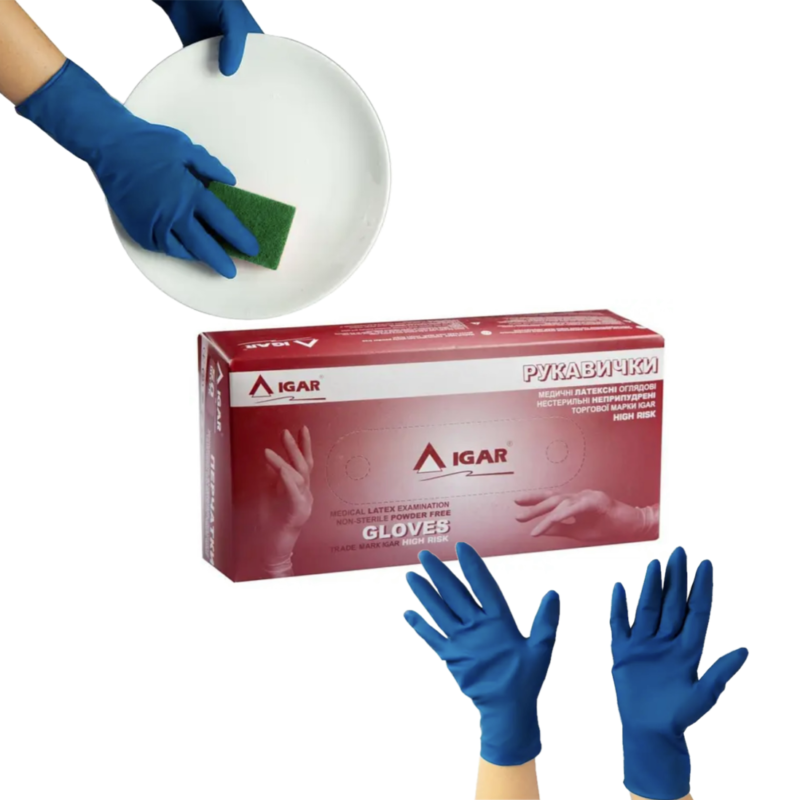 Латексні рукавички ТМ IGAR HIGH RISK – підвищеної міцності, щільні, зносостійкі, нестерильні, неприпудрені, синього кольору.