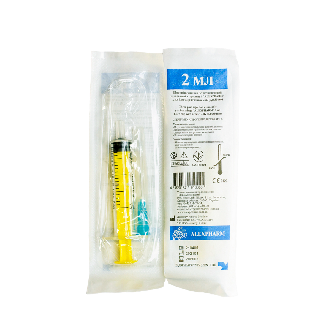 Шприц ін’єкційний 3-х компонентний одноразовий стерильний “ALEXPHARM” 2 мл Luer Slip з голкою, 23G (0,6×30 мм)